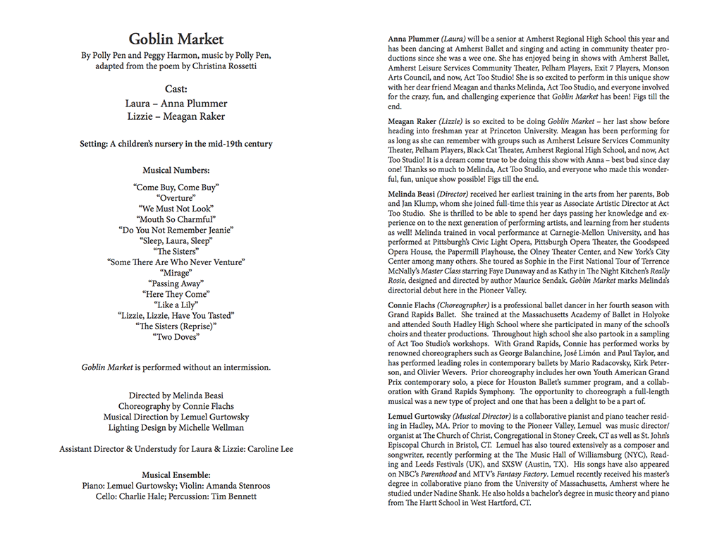 I’m here to say that Act Too Studio’s Teen Opera Workshop is the best thing I’ve ever been a part of. It’s given me confidence. It’s made me feel a kind of joy I’ve never felt before. And it gives me hope that more people like me: young, black and queer, will get to have a place in the world of opera. Be it listening or performing. Sylvia Simmons Student My love for classical music goes way back. Both my parents love it, and I have grown up listening to and appreciating it. It always played a role in my life. But as I got older, other genres pushed aside classical. Teenagers just don’t listen to classical, let alone sing it, right? Wrong. At Act Too Studio, not only is it ‘cool’, it proves that teenagers can, and do, love opera. I go in every week and watch teens my age singing from the heart in powerful, well-trained voices. They show what young people are capable of, and I feel so honored to be able to sing alongside them. They push me to work hard and believe in myself. We are a team, and we cheer each other on and support each other. Melinda works endlessly to teach us what we need to know to fully appreciate and be able to sing such beautiful music. We are so lucky to have such a dedicated and passionate teacher. Act Too Studio has created a safe haven for those who perhaps don’t quite fit in with the stereotypically ‘cool’ kids. Opera Workshop is a place where we can be vulnerable, and expressive, and learn and grow. Other kids ask us how we got our voices to be so good, and to their shock, we answer, “opera.” Teens who have maybe ridiculed opera in the past begin to see how wonderful it really is. We open young people’s eyes to this beautiful art form, and they — we — become stronger and kinder and more creative because of it. I think *that’s* cool. Isabelle Bouvier Student When I was younger, I had the stereotypical connotation of high, off-key music, sung by old people in languages I couldn’t understand. Now, if you say the word ‘Opera’ to me, I think of thousands of wonderful memories, from the loving social environment, to the incredible skills I’ve learned. Act Too Studio’s Opera Workshop is truly a life changing experience. I have grown so much as a performer from just a year, and I can’t wait to continue for as long as possible. Milena Gravente-Gunnells Student Who knew that teens could not only perform outstanding and sophisticated opera but also relish every minute of it? Who knew that I would thoroughly enjoy watching opera? Not me. That’s for sure. Both of my teenagers have been a part of Act Too Studio’s opera productions and gained an acute appreciation for this art form. It is a phenomenal and innovative program. Act Too Studio has been a major part of my children’s lives and shaped their futures! I am so grateful we found them!!!!!! Cecilia Mathewson Parent Back in May of last year, I saw Melinda posted an inquiry on Facebook for an assistant stage manager for the Opera Workshop’s summer production, Il sogno d’Arianna-to which I messaged her and got it! This was some of my first real exposure to classical music. After the first rehearsal my idea of what opera and classical music was shattered. Instead of being this thing where people sing crazy high notes with a Viking helmet on, it morphed into a real art form. It’s incredible to me how all of us originally have these preconceived notions about what opera is, and how we view it, yet when submerged in all of its glory you feel and relate to this music written hundreds of years ago. The human connection and human experience of opera is a beautiful thing that I’m glad I’m a part of. What made me most proud of being a part of Il sogno d’Arianna was during the final week of rehearsal, when we ran the show fully and completely. I’ll never forget getting chills up my arms and tears on my face, all because of teenagers singing. It is truly incredible and I’m so, so glad I have the opportunity to not only be a part of this coming summer’s opera production, but sing alongside those who made me fall in love with classical music. Craig Judicki Student When I first started studying with Melinda, I didn’t realize how much of an impact our weekly lessons would have on me. Within a few months, I was hooked. I am now determined to pursue a career in classical singing. Opera is one of the most challenging, exciting and most beautiful art forms to study. When I first started taking lessons, it never occurred to me that being an opera singer meant not only knowing how to sing, but also acting and knowing multiple languages. It was both exhilarating and overwhelming. Thanks to Melinda and my peers, at Opera Workshop, I came to be comfortable with the various aspects of opera singing. Please support us today, so we can continue learning our craft, and by doing so, continue to inspire other teens. Liam Shannon Student Act Too Studio Opera Workshop has meant the world to me. Three summers ago we had the first performance of scenes from the second act of The Marriage of Figaro. I signed up not fully knowing what I was getting myself into but ended up having an amazing time! I had done musical theater for years, but never opera and I had no idea that opera could be just as hilarious, thought provoking, and engaging as musical theater. I learned to love and respect an entirely different style of music that I have continued to learn and love over the past several years. Melinda and Act Too Studio Opera Workshop provide something that is incredibly unique and necessary for The Pioneer Valley. There are plenty of opportunities for teen performers to participate in musicals, plays, or choirs where classical music is sometimes performed, but there is almost no other opportunity for teens to participate and get engaged in the world of Opera with a group of likeminded peers. While next year in college I will ultimately be studying Musical Theater, I will do so in a music cent